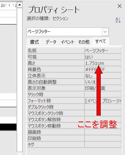 そこで、レポートのページフッターをクリックして選択し、プロパティで高さを少しずつ足して調整していきます。